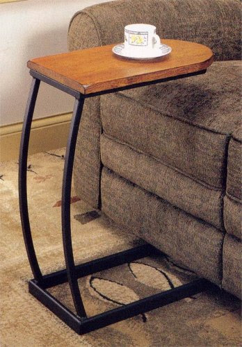 This snack table with a distressed oak finished top and black metal base fits snuggly into a space of a sofa. Dims: 18" X 10" X 24".