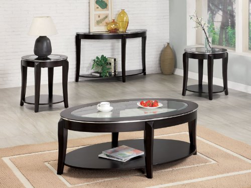 This beautiful three piece occasional table set will help you give your contemporary living room a quick style update. The cocktail table and two end tables feature sleek shaped legs, in a deep rich Cappuccino finish. Lower shelves offer space for books, magazines, and decorative items. Elegant rounded wood framed table tops on each piece feature a shiny metal accent, with sophisticated inset beveled glass in the center of each. Add a lamp, or your favorite decorative items for a personal look, with chic contemporary flair. Add this three piece occasional table set to your home for a warm look you will love. Features: In Cappuccino Finish Contemporary Style Sleek styled legs Clear glass top 5x stonger tempered glassSpecifications: Coffee Table Dimensions: 18"H x 30"W x 50"D End Table Dimensions: 24"H x 24"W x 24"D Weight: 105.60 lbs