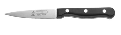 For peeling and slicing just about any fruit or vegetable, a good paring knife is one of the most indispensable kitchen tools. This Messermeister Park Plaza 4-inch paring knife is made in Germany of a high-carbon stainless steel that combines chromium, molybdenum, and vanadium for tensile strength, hardness, and resistance to corrosion. The full-length tang (meaning the metal blade continues all the way through to the end of the handle) gives you a stronger and better balanced knife. Three rivets keep the tang attached to the black hygienic composition handle. This knife feels substantial and balanced in your hand. Although it is dishwasher-safe, it's best to hand wash your knives to keep the steel blades scratch-free.